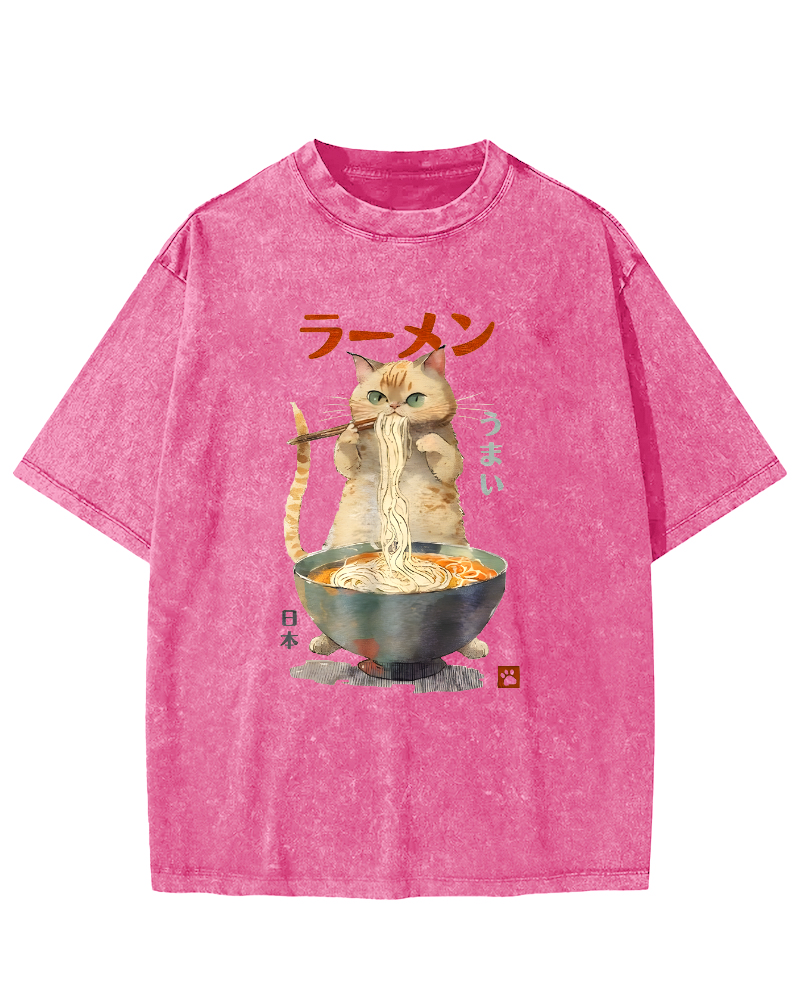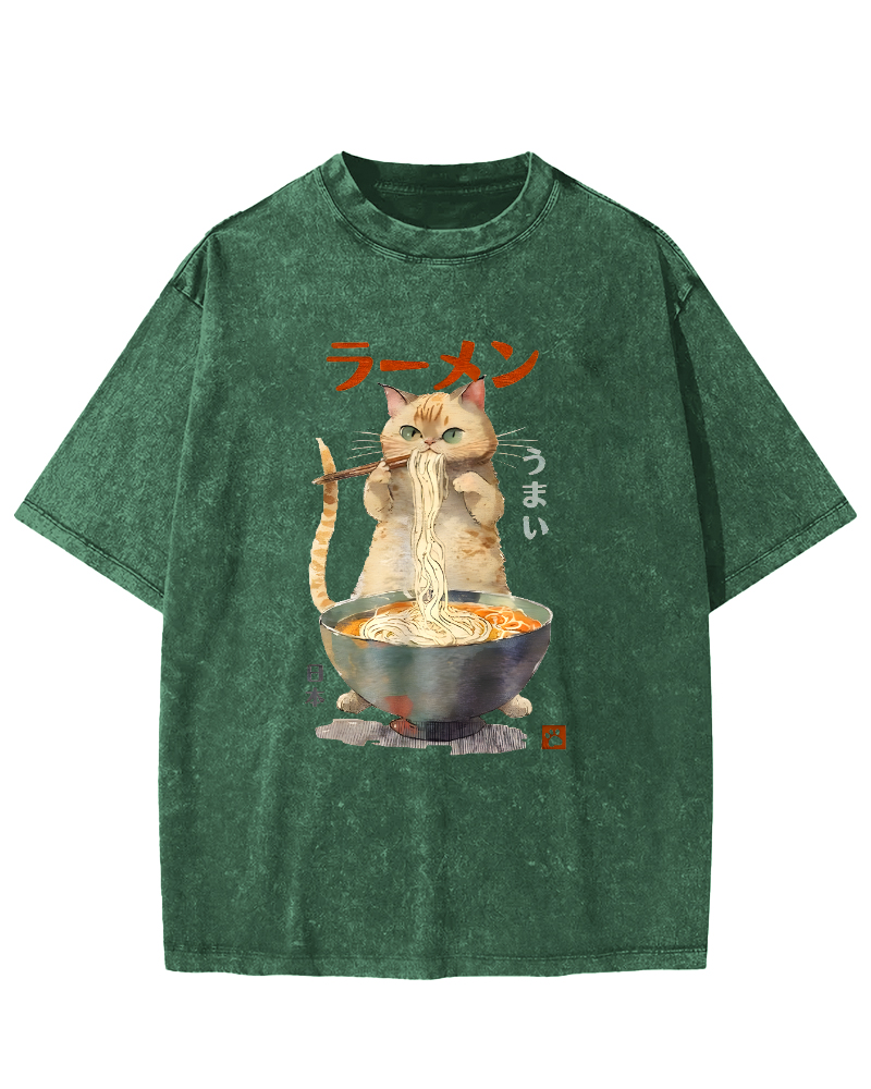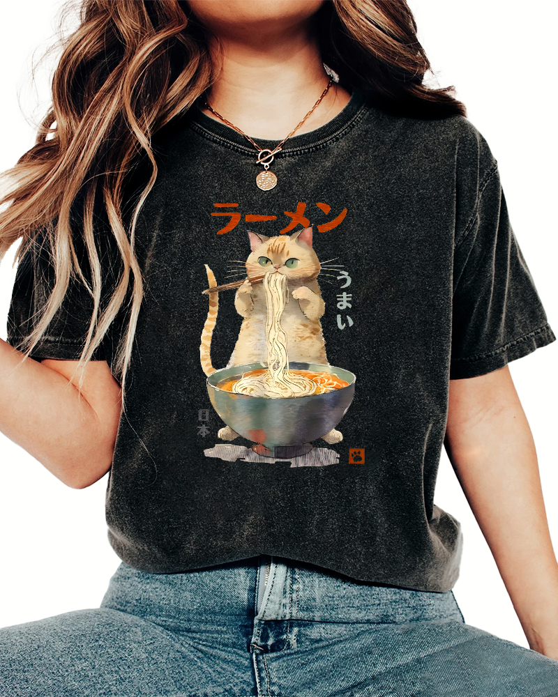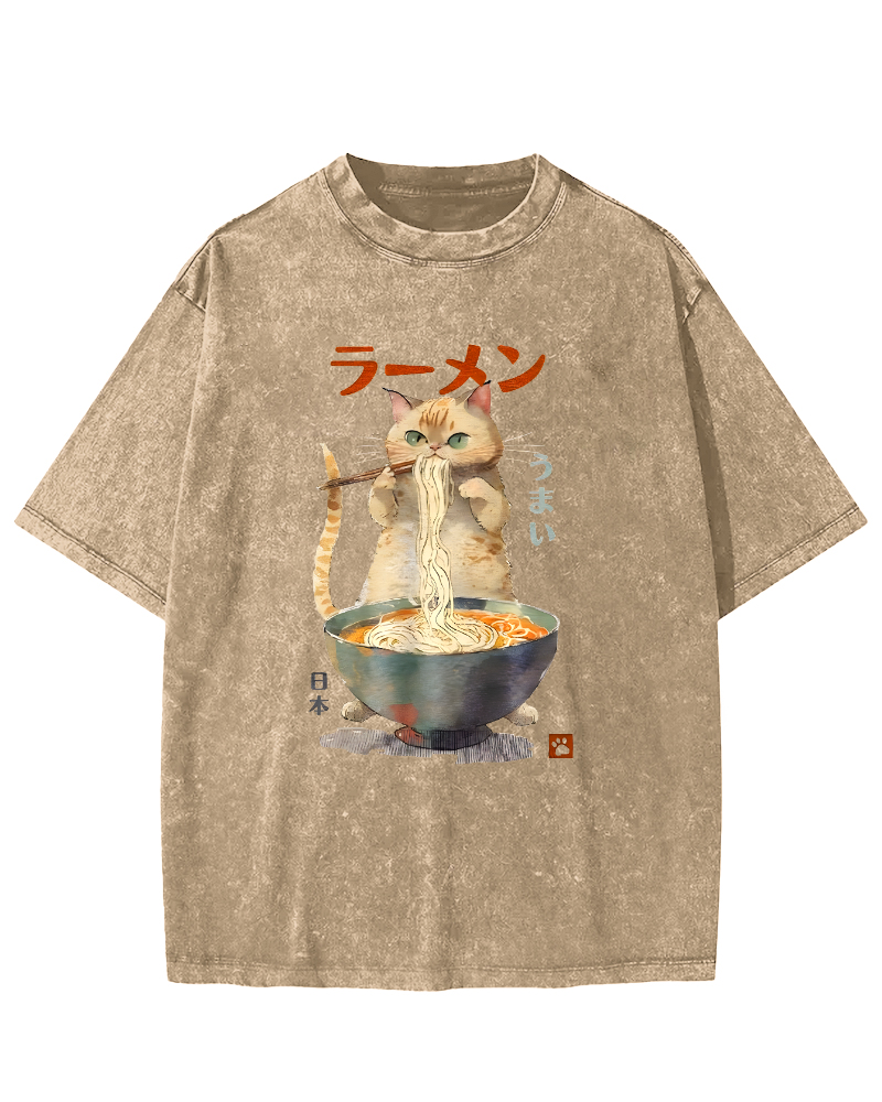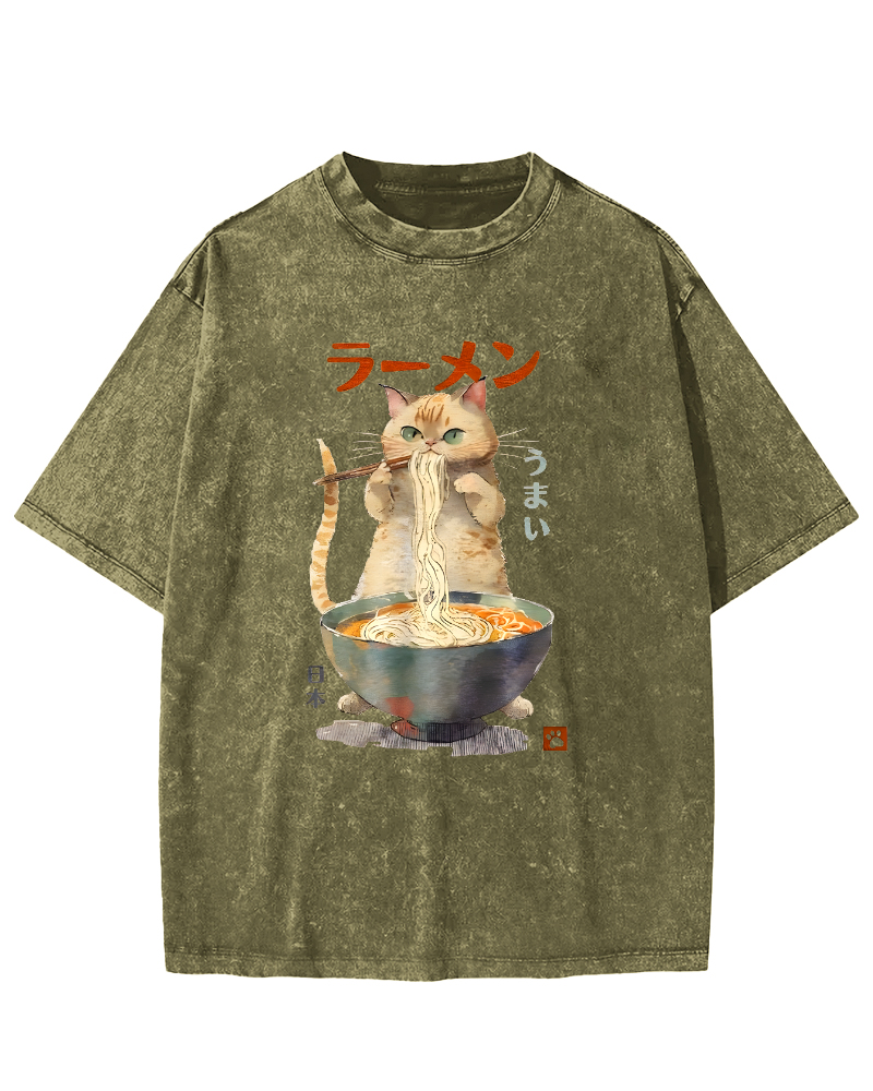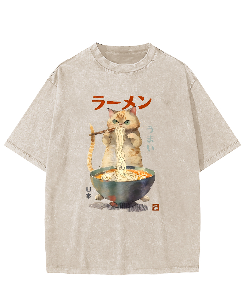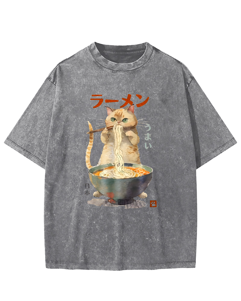 • Loves Lamian Noodles Cute Cat Vintage Washed T-shirt