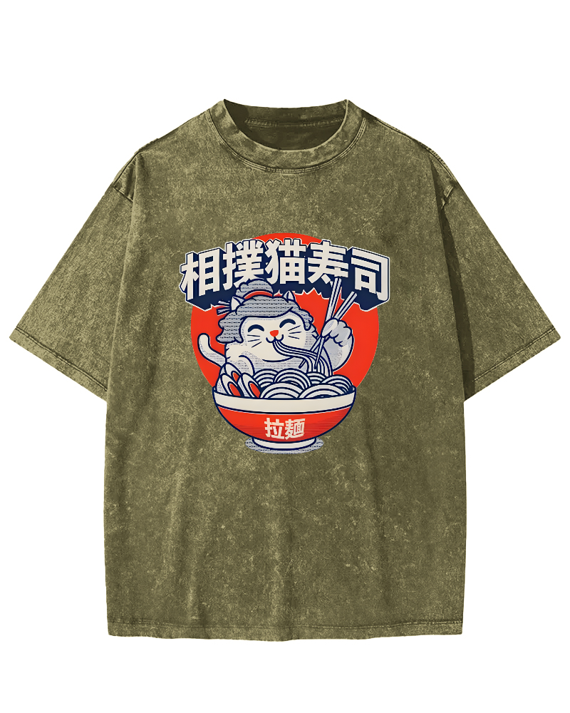 Sumo cat Lamian Noodles feast Vintage Washed T-shirt