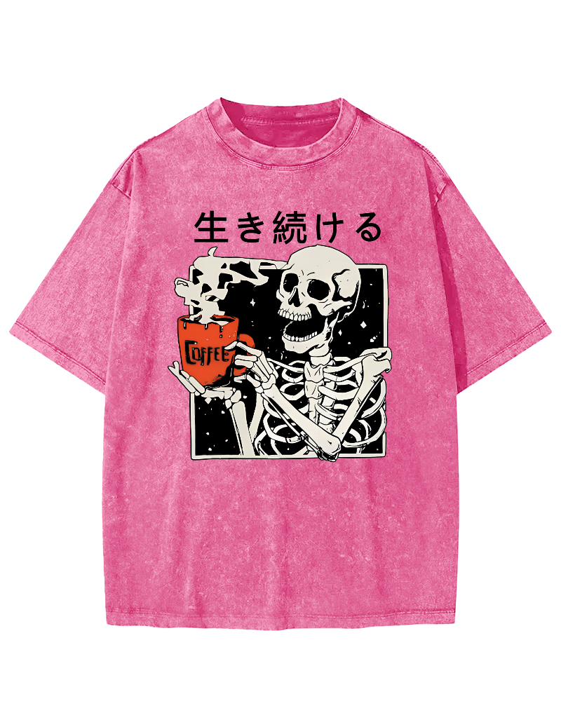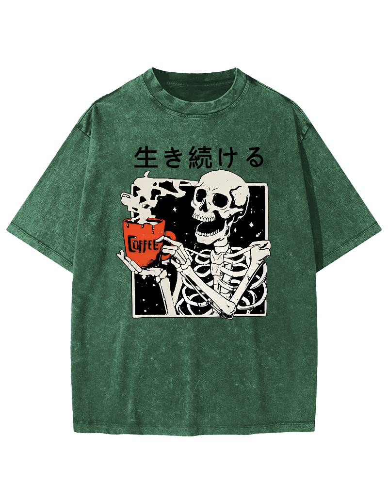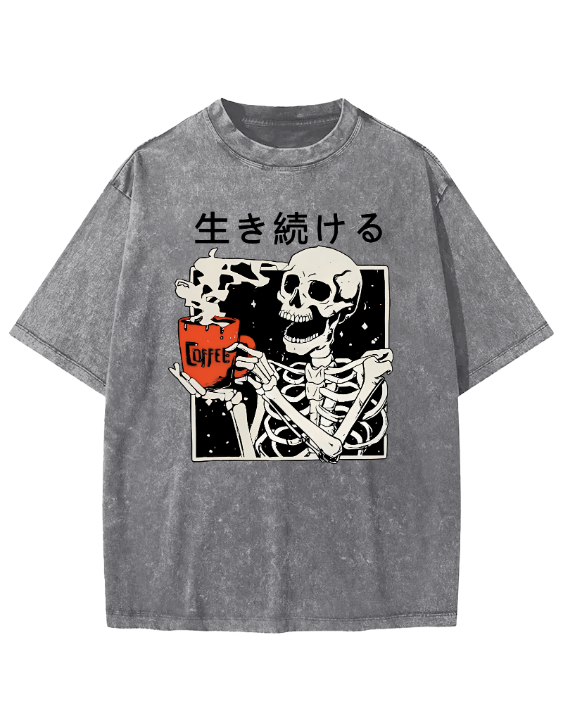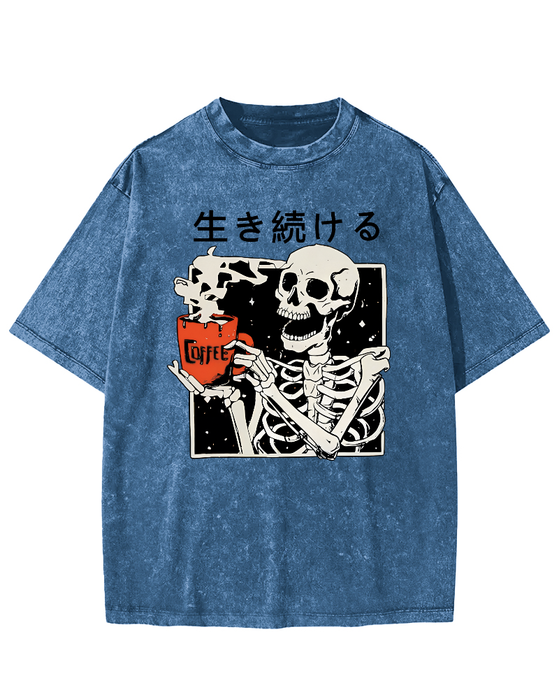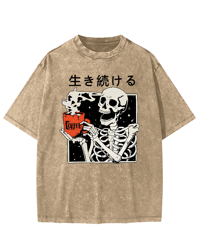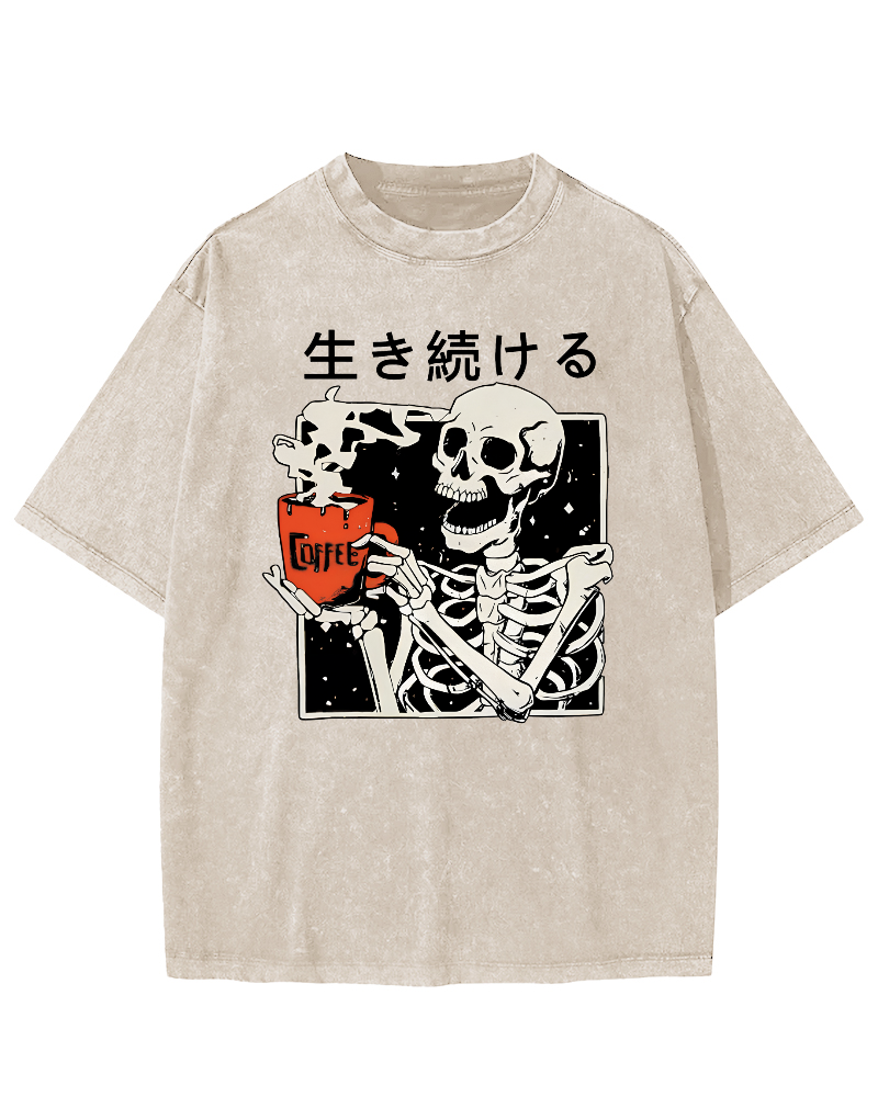 Survival Skeleton Drinking Coffee Japanese Style Vintage Washed T-shirt