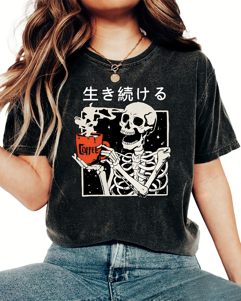 • Survival Skeleton Drinking Coffee Japanese Style Vintage Washed T-shirt