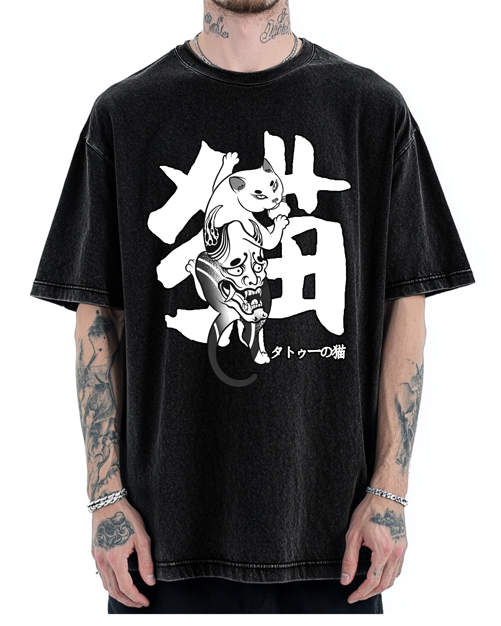Cat With Oni Mask Tattoo Vintage Washed T-shirt