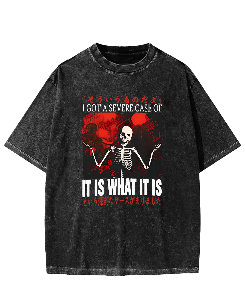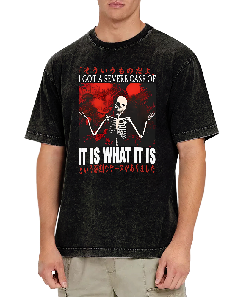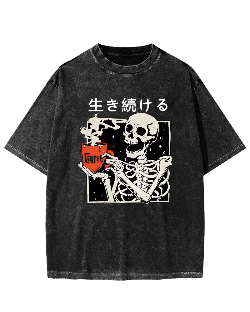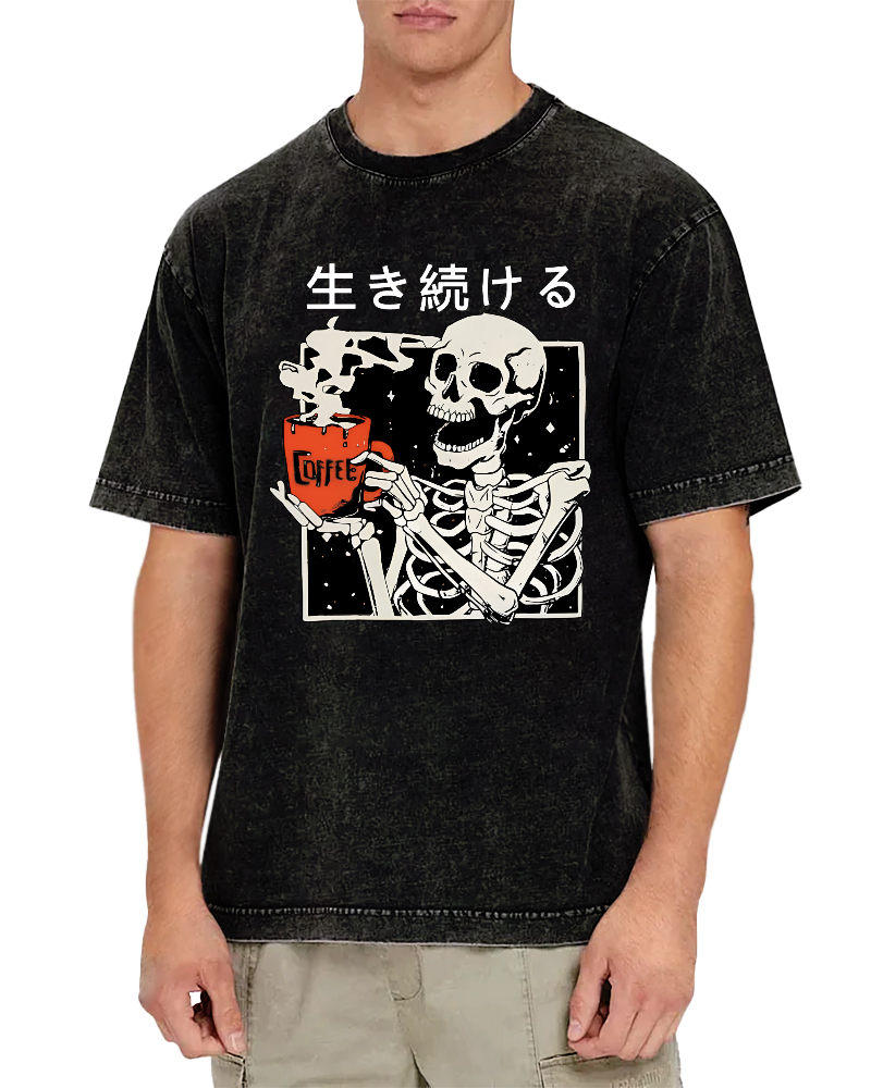 Survival Skeleton Drinking Coffee Japanese Style Vintage Washed T-shirt